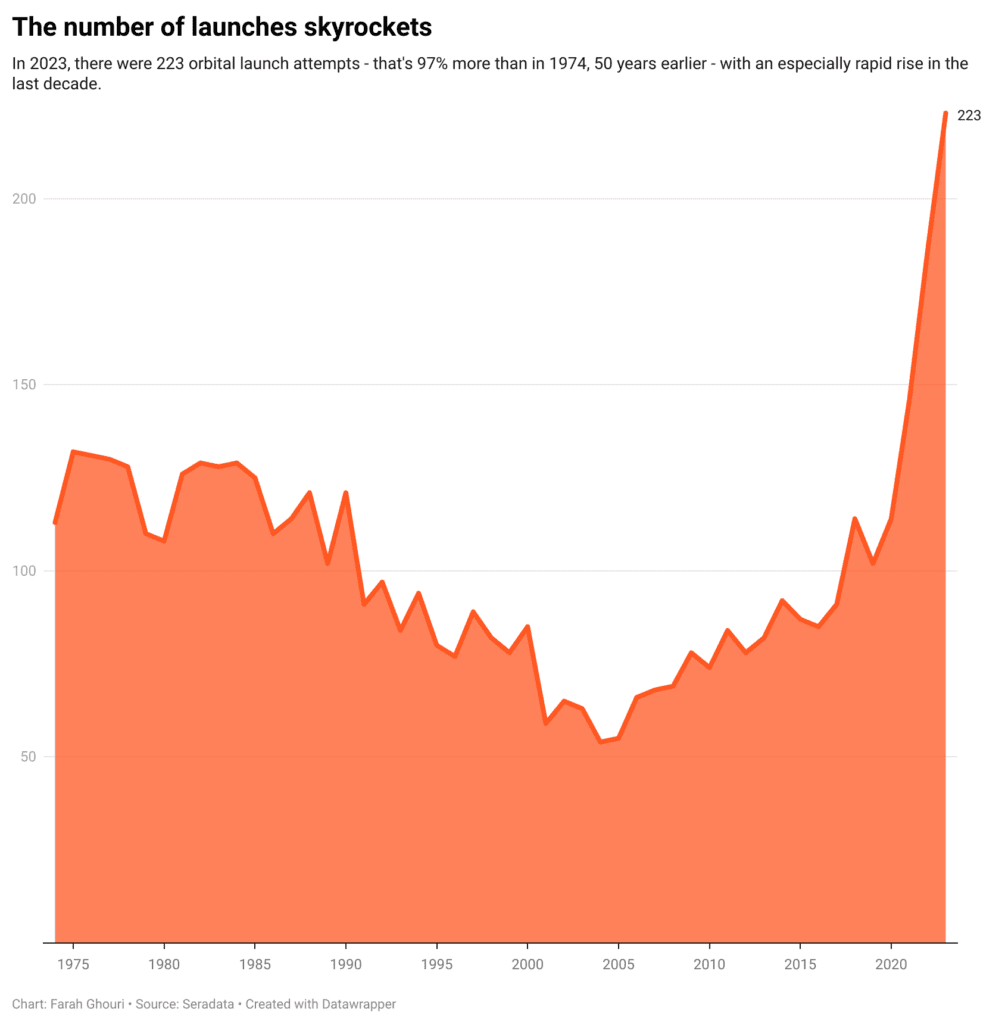 The number of launches has broken the all-time record – again. This year there were 223 orbital launch attempts, which breaks last year’s record of 186 attempts. This continues the trend since 2019, and the general trend since 2005, of an ever-increasing number of launches. SpaceX dominated the market with just under half the flights. With a total of 98 orbital launch attempts (Falcon 9, Falcon Heavy and Starship), it came top of the launch providers but just missed its 100-launch annual target.
