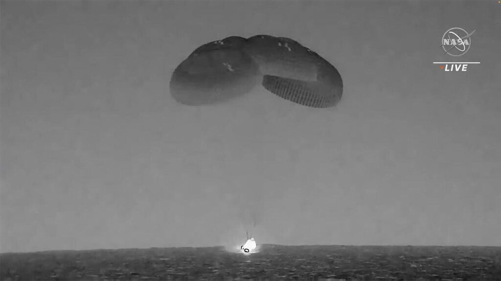 Infra-red camera image of Crew Dragon – NASA Crew 6 capsule splashing down. Courtesy: NASA TV